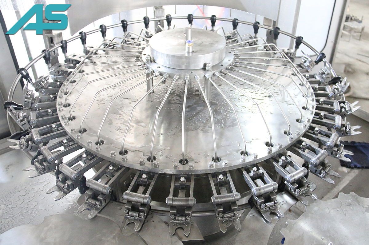 2、沖洗瓶口采用先進(jìn)的卡瓶頸技術(shù),避免與螺紋口的接觸,衛(wèi)生,瓶子的輸送全部采用卡瓶頸技術(shù),變換瓶形無需調(diào)整高度,只需變換瓶身直徑相關(guān)的護(hù)板。